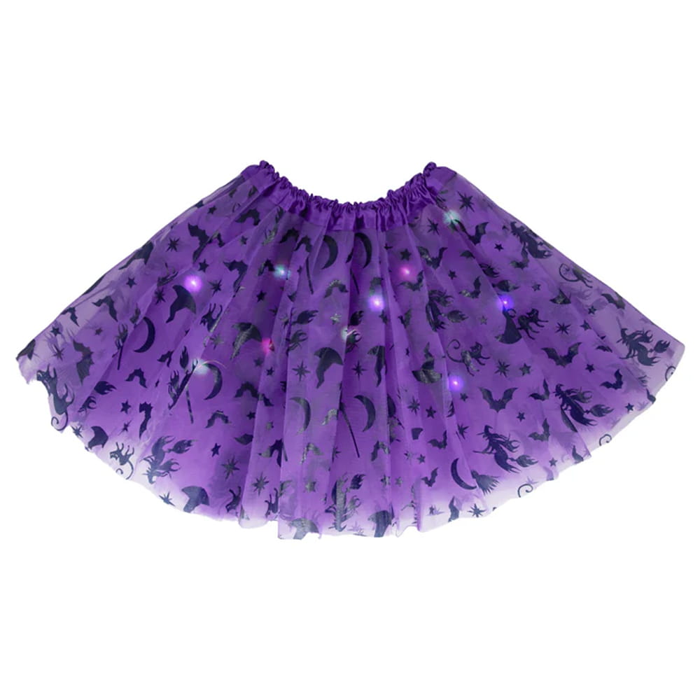 Fioletowa spódniczka tiulowa ozdobiona czarnym wzorem czarownicy, gwiazdek i nietoperzy sprawdzi się doskonale jako dodatek do halloweenowego lub andrzejkowego stroju czarownicy! Dodatkowym atutem są lampki wszyte pod warstwy tiulu, dzięki czemu spódniczka świeci!
