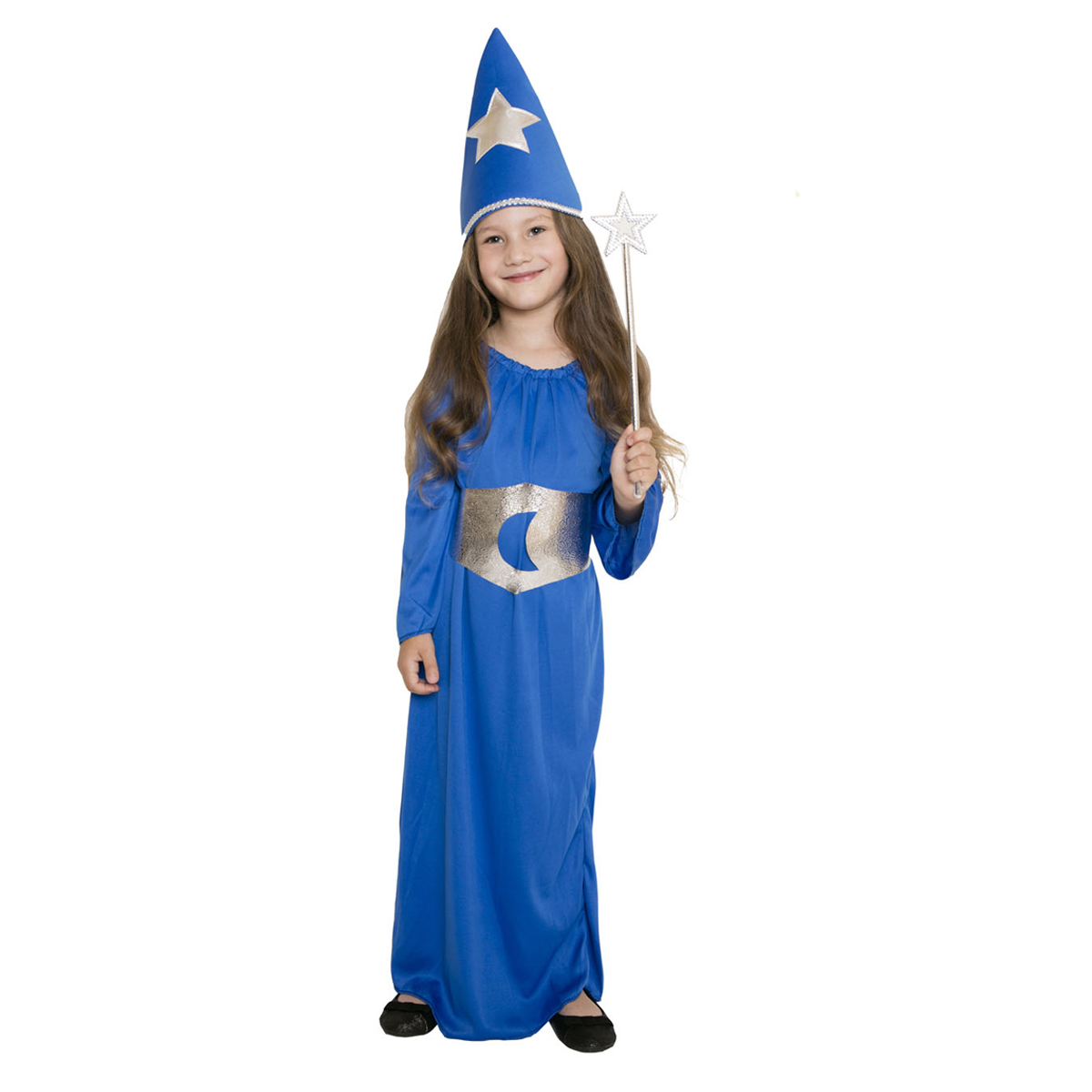 Zbliża się Karnawał, Bal Przebierańców, Andrzejki - a może po prostu urodziny Twojego Maluszka i szukasz odpowiedniego przebrania? Oto idealne rozwiązanie: sukienka czarodziejki! Kostium składa się z niebieskiej, długiej sukienki z długimi rękawami i srebrnym, zdobnym pasem, wraz z wysokim, spiczastym kapeluszem w tym samym kolorze.
