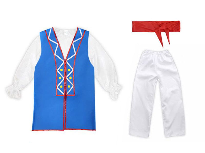 Kostium chłopięcy składa się z białej koszuli z długim rękawem, niebieskiej kamizelki obszytej czerwonymi tasiemkami,