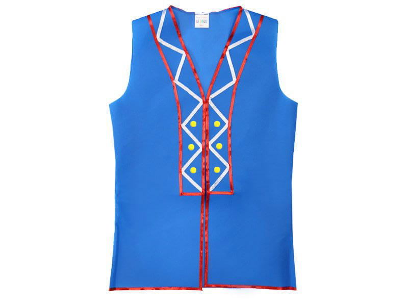 Kostium chłopięcy składa się z białej koszuli z długim rękawem, niebieskiej kamizelki obszytej czerwonymi tasiemkami,