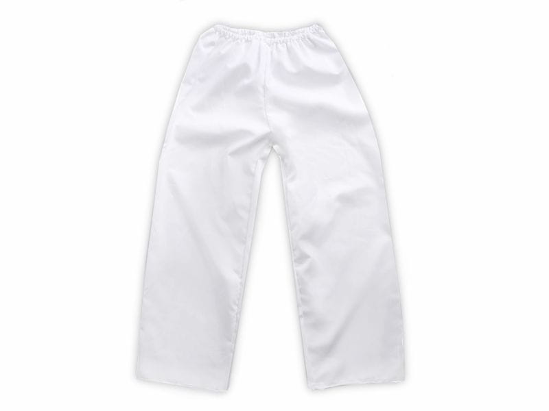 długich spodni na gumce w kolorowe paski oraz czerwonego pasa do przewiązania w biodrach.