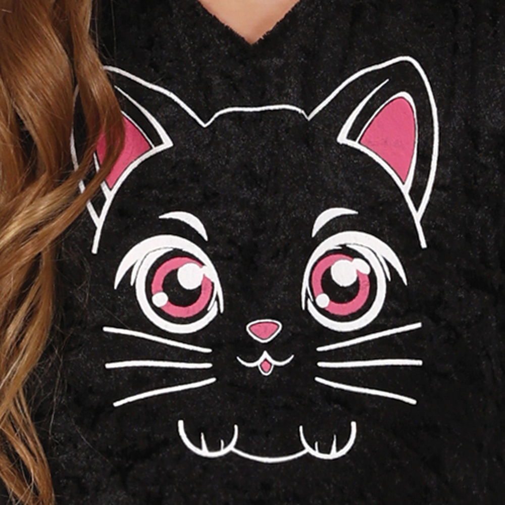 Czarna sukienka z nadrukiem radosnego kotka,