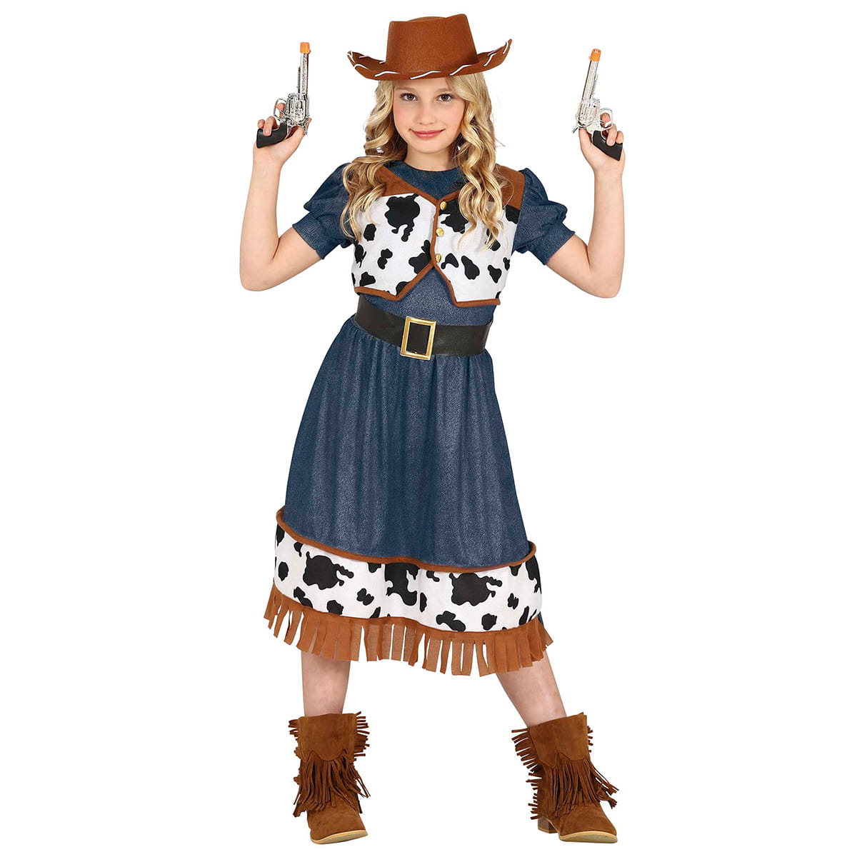 Niebieska sukienka z doszytą łaciatą kamizelką i ozdobiona łaciatym brzegiem i brązowymi frędzelkami to doskonała propozycja dla małej, dzielnej kowbojki!