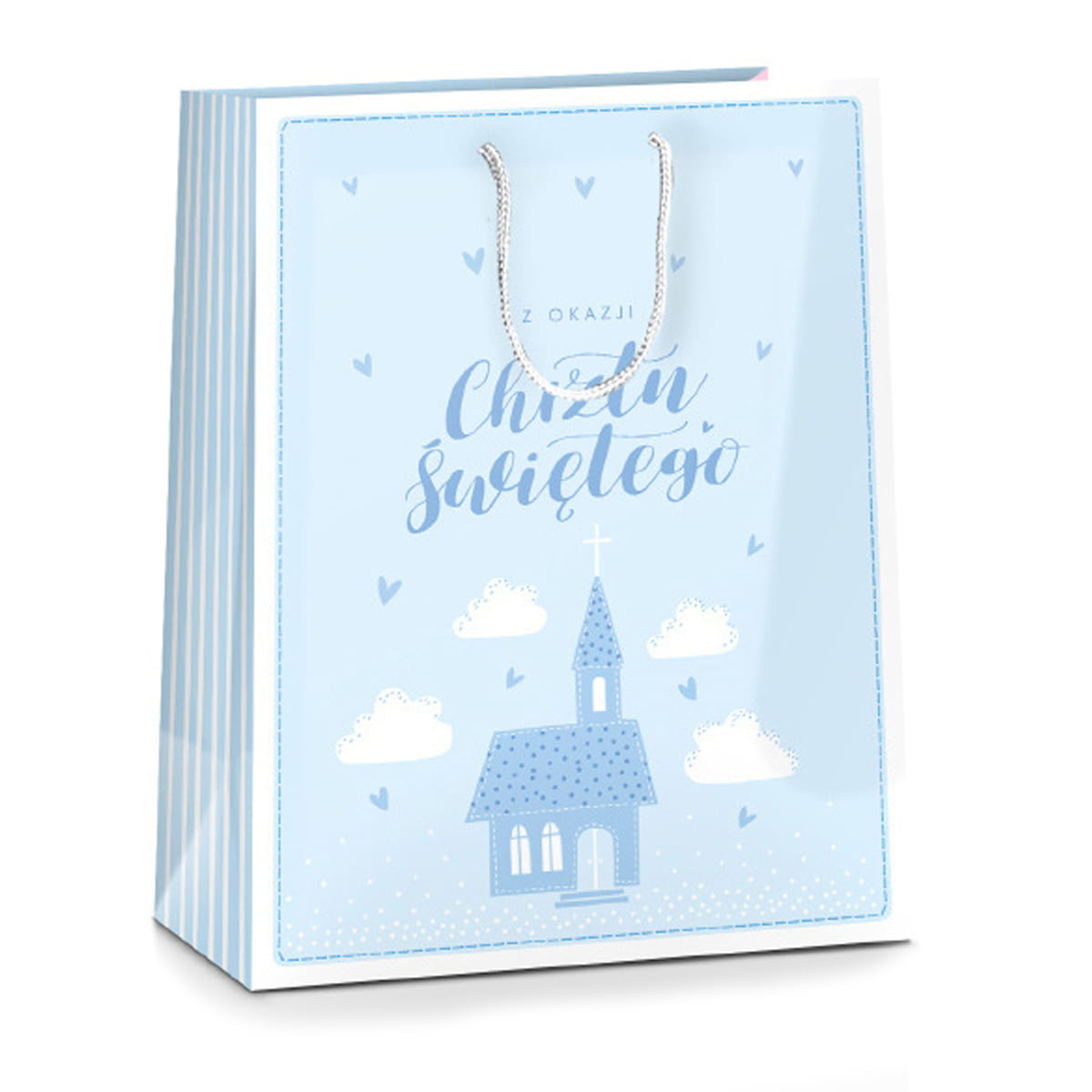 Błękitna torebka prezentowa ozdobiona serduszkami, chmurkami, małym kościółkiem oraz napisem "Z okazji Chrztu Świętego" sprawdzi się idealnie do zapakowania prezentu z okazji chrztu!