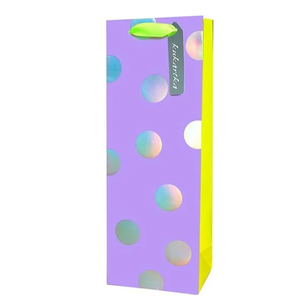 Elegancka, fioletowa torebka prezentowa ozdobiona opalizującymi groszkami i wyposażona w atłasową, jasnozieloną rączkę będzie świetnie pasować do zapakowania prezentu na wiele okazji!
