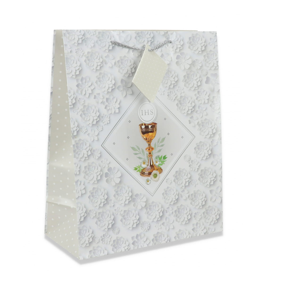 TOREBKA PREZENTOWA KOMUNIA KWIATY KIELICH BIAŁA 23x18cm