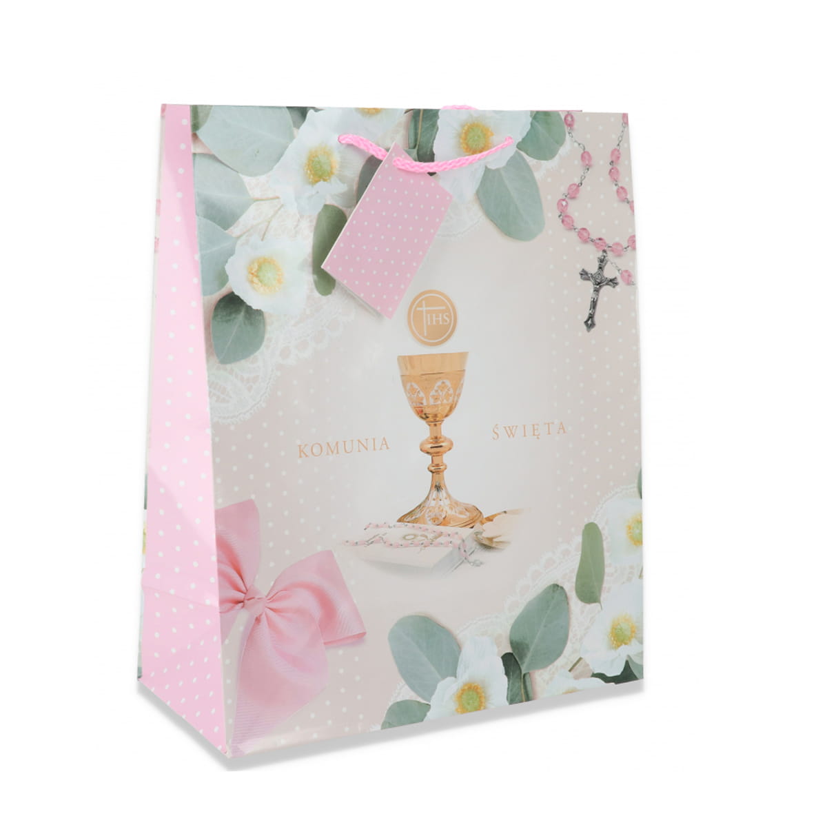Różowa torebka prezentowa ozdobiona białymi kwiatkami, listkami, różańcem, kokardką oraz złotym kielichem, sprawdzi się idealnie do zapakowania prezentu na I Komunię Świętą!