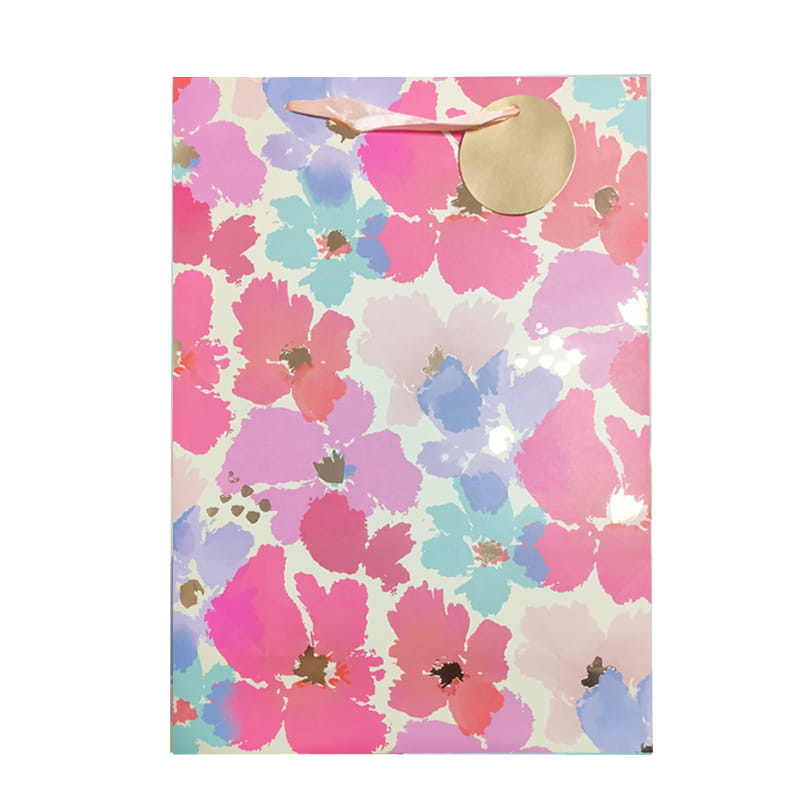 Torebka prezentowa ozdobiona wielokolorowymi kwiatamki oraz jasnoróżową, satynową rączką z dołączonym okrągłym, złotym bilecikiem sprawdzi się idealnie do zapakowania prezentu na każdą okazję!