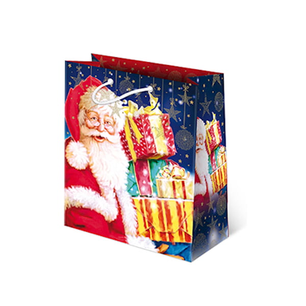 Stylowa, estetyczna torebka ozdobna to znakomity sposób na zapakowanie świątecznego prezentu! Torebka ozdobiona jest Świętym Mikołajem trzymającym stos prezentów, co podkreśla bożonarodzeniowy klimat podarku! Torba posiada wytrzymałe uchwyty pozwalające na bezpieczny transport prezentu bez obawy o jego uszkodzenie.