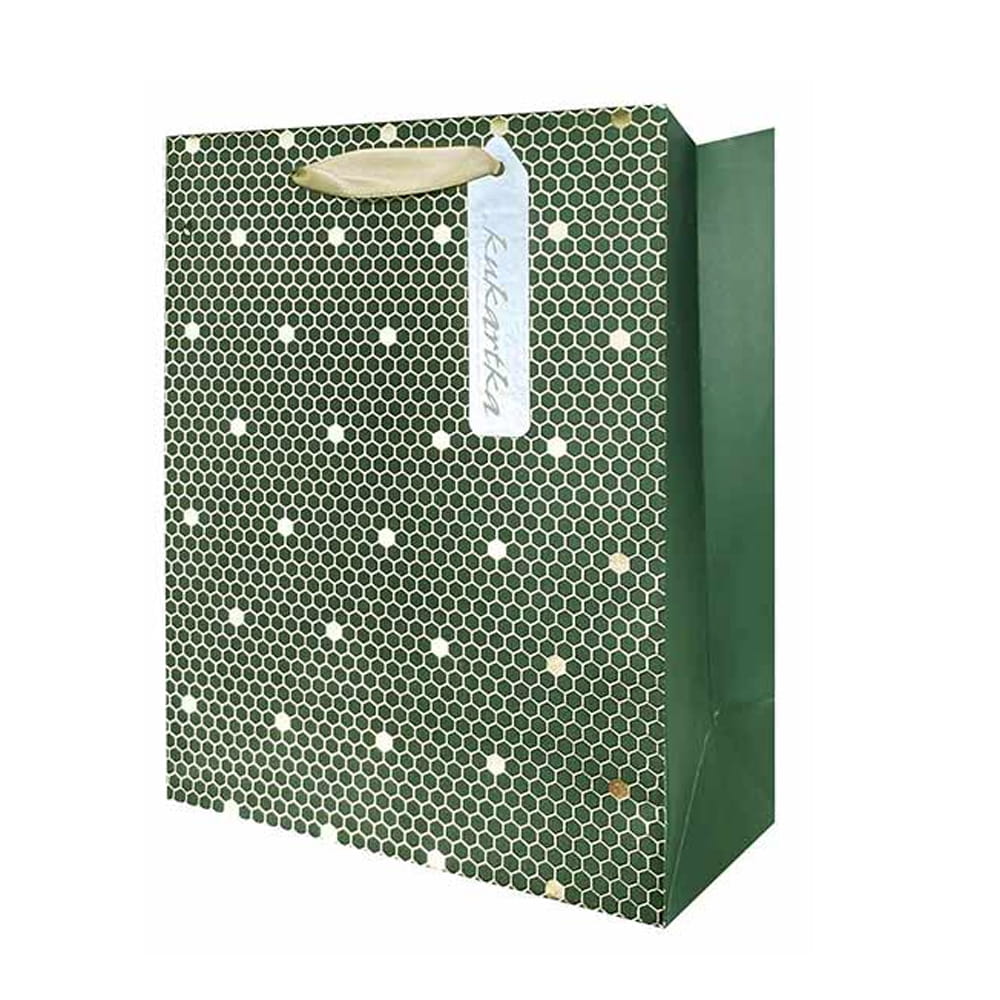 Elegancka, ciemnozielona torebka prezentowa ozdobiona małymi, złotymi plastrami miodu i wyposażona w atłasową, złotą rączkę będzie świetnie pasować do zapakowania prezentu na wiele okazji!