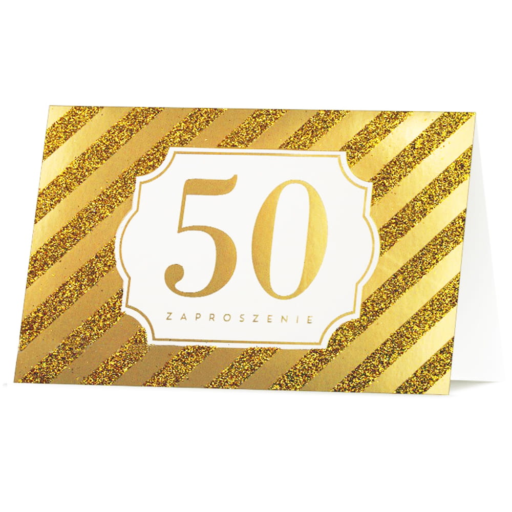 Złote, brokatowe zaproszenia na 50. urodziny do własnoręcznego wypełnienia danych w zestawie z dopasowanymi kopertami sprawdzi się idealnie na 50. urodziny!