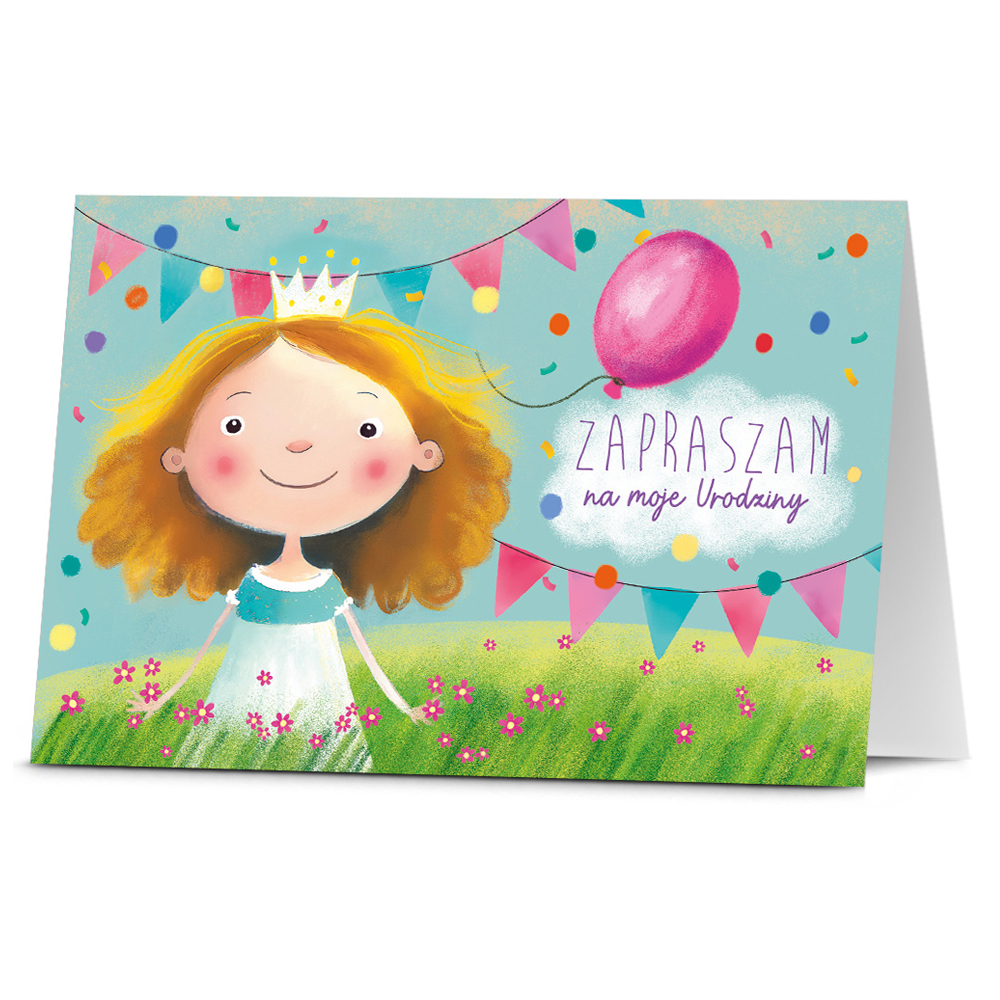 Pięć zaproszeń z grafiką księżniczki z balonikiem oraz napisem "Zapraszam na moje Urodziny" w kolorze błękitnym w zestawie z kopertami sprawdzi się doskonale na urodziny!