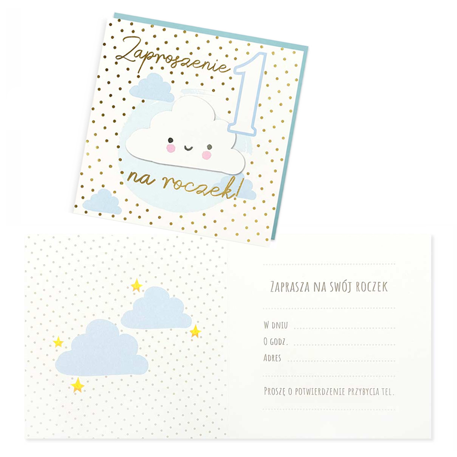 Szykujesz przyjęcie urodzinowe dla swojego dziecka i zastanawiasz się nad odpowiednim motywem przewodnim? Świetnie sprawdzi się temat uśmiechniętych chmurek! Zaproszenia w kolorze białym udekorowane są złotymi groszkami, wesołą chmurką oraz napisem "Zaproszenie na roczek!". W środku znajduje się miejsce na wypisanie danych wydarzenia.