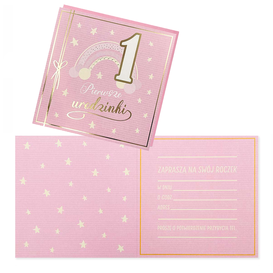 Szykujesz przyjęcie urodzinowe dla swojego dziecka i zastanawiasz się nad odpowiednim motywem przewodnim? Oto zaproszenia w kolorze różowym, udekorowane gwiazdkami, tęczą oraz napisem "Pierwsze urodzinki". W środku znajduje się miejsce na wypisanie danych wydarzenia.
