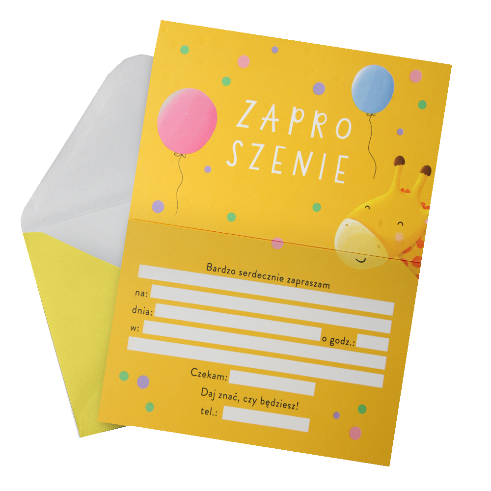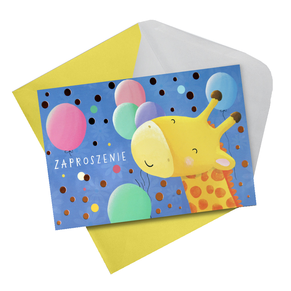 Pięć zaproszeń z grafiką żyrafy w kolorze niebieskim uzupełnione balonikami i złotymi kropkami oraz napisem "Zaproszenie" w zestawie z kopertami sprawdzi się doskonale na wiele okazji!