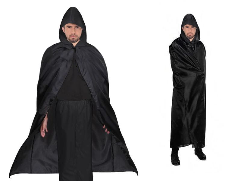Czarna, długa peleryna z kapturem,