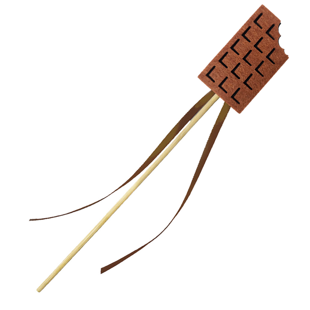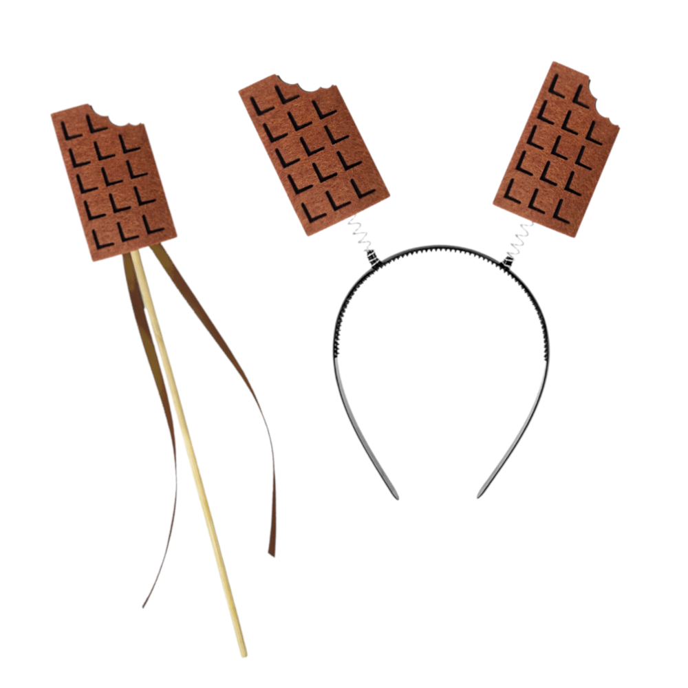 - drewniana różdżka - posiada na szczycie filcowy emblemat tabliczki czekolady i ozdobiona jest dodatkowo lekkimi, brązowymi tasiemkami: