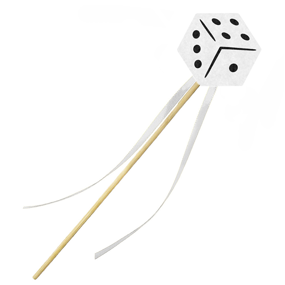 - drewniana różdżka - posiada na szczycie filcowy emblemat kostki do gry i ozdobiona jest dodatkowo lekkimi, białymi tasiemkami: