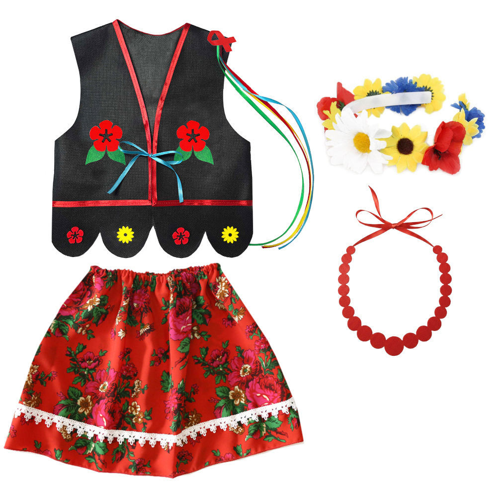 W skład zestawu dla Krakowianki wchodzą: - czarna, wigofilowa kamizelka - czerwona spódniczka na gumce - kolorowy wianek na opasce - czerwone filcowe korale