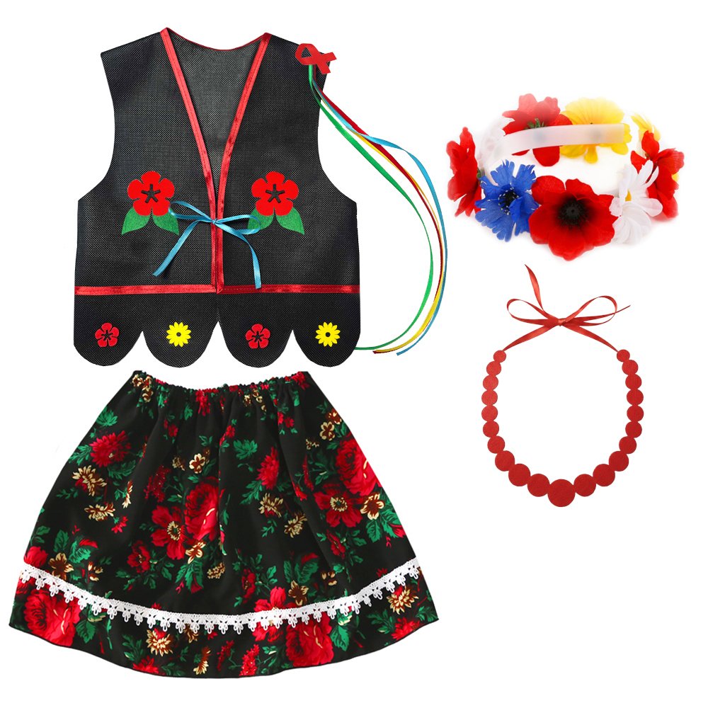 W skład zestawu dla Krakowianki wchodzą: - czarna, wigofilowa kamizelka - czarna spódniczka na gumce - kolorowy wianek na opasce - czerwone filcowe korale