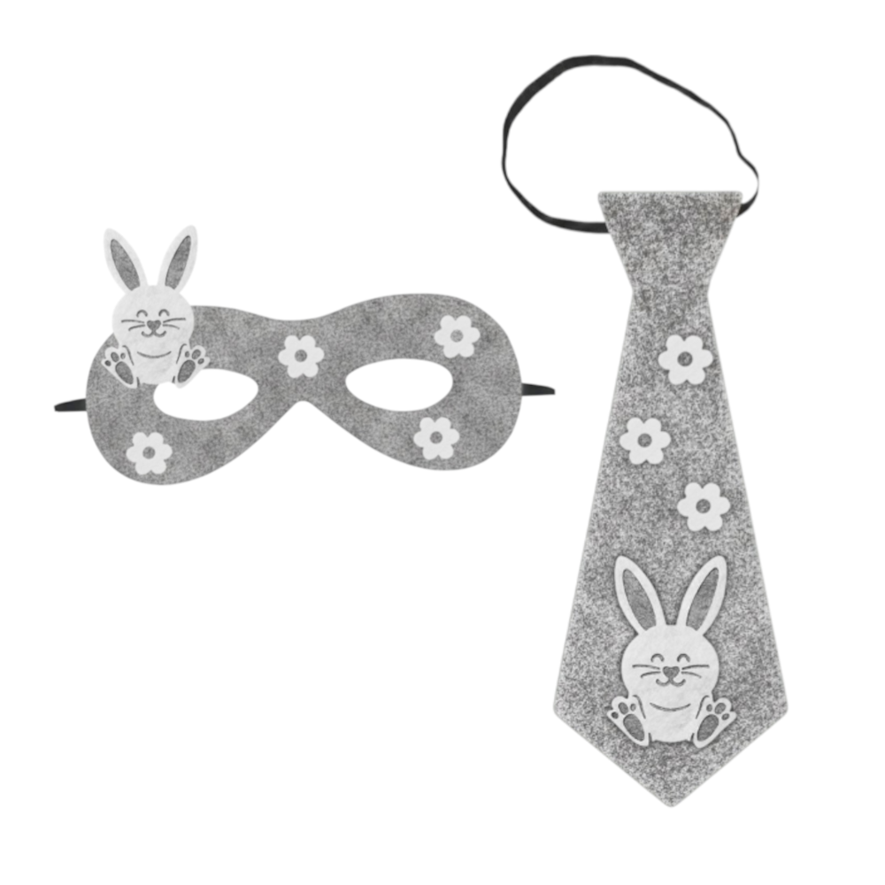 - szary krawat wykonany z miękkiego filcu, został wzbogacony o uśmiechniętego, białego króliczka, a całość dopełniają kwiatuszki w kolorze białym.