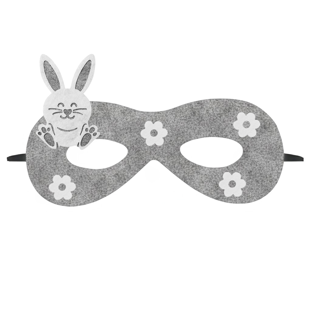 - maska króliczek - filcowa maska w kolorze szarym, została udekorowana uśmiechniętym, białym króliczkiem oraz kilkoma białymi kwiatkami, z tyłu przymocowana jest elastyczna gumka, dzięki czemu maska stabilnie układa się na głowie: