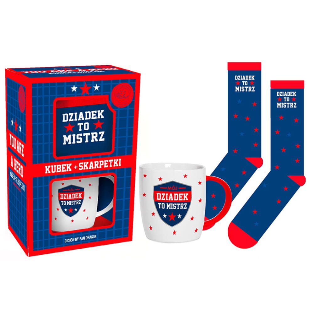 Spraw swojemu Dziadkowi uroczy podarek z okazji Dnia Dziadka, Bożego Narodzenia lub innych ważnych okazji! Oto zestaw zawierający biały, ceramiczny kubek ozdobiony napisem "Mój Dziadek to mistrz" wraz z czerwonymi gwiazdkami oraz niebieskie skarpetki z napisem "Dziadek to mistrz". Całość zapakowana jest w estetyczny, zielono-niebieski kartonik, dzięki czemu prezent gotowy jest do wręczenia!