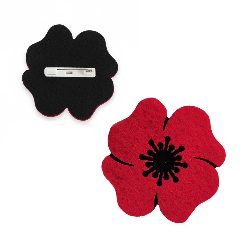 - przypinka mak - składa się z dwóch warstw filcu – czarnej bazy oraz czerwonej nakładki, która odwzorowuje szczegóły kwiatka takie jak delikatne zarysy płatków czy środek maku.