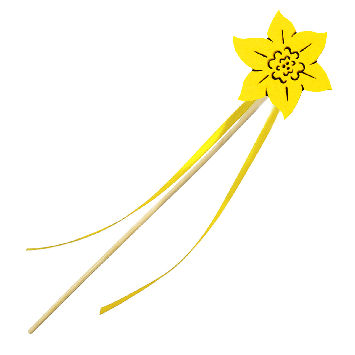 - różdżka kwiatek - składa się z trzech elementów: drewnianego patyczka, solidnie przymocowanego emblematu kwiatka oraz dwóch żółtych tasiemek.