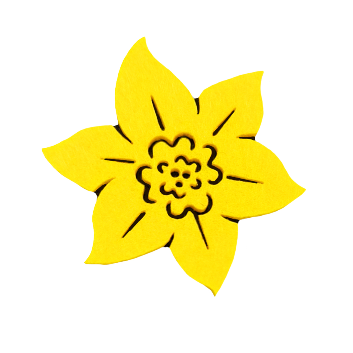 - przypinka żonkil - składa się z dwóch warstw filcu – czarnej bazy oraz żółtej nakładki, która odwzorowuje szczegóły kwiatka takie jak delikatne zarysy płatków czy środek żonkila.