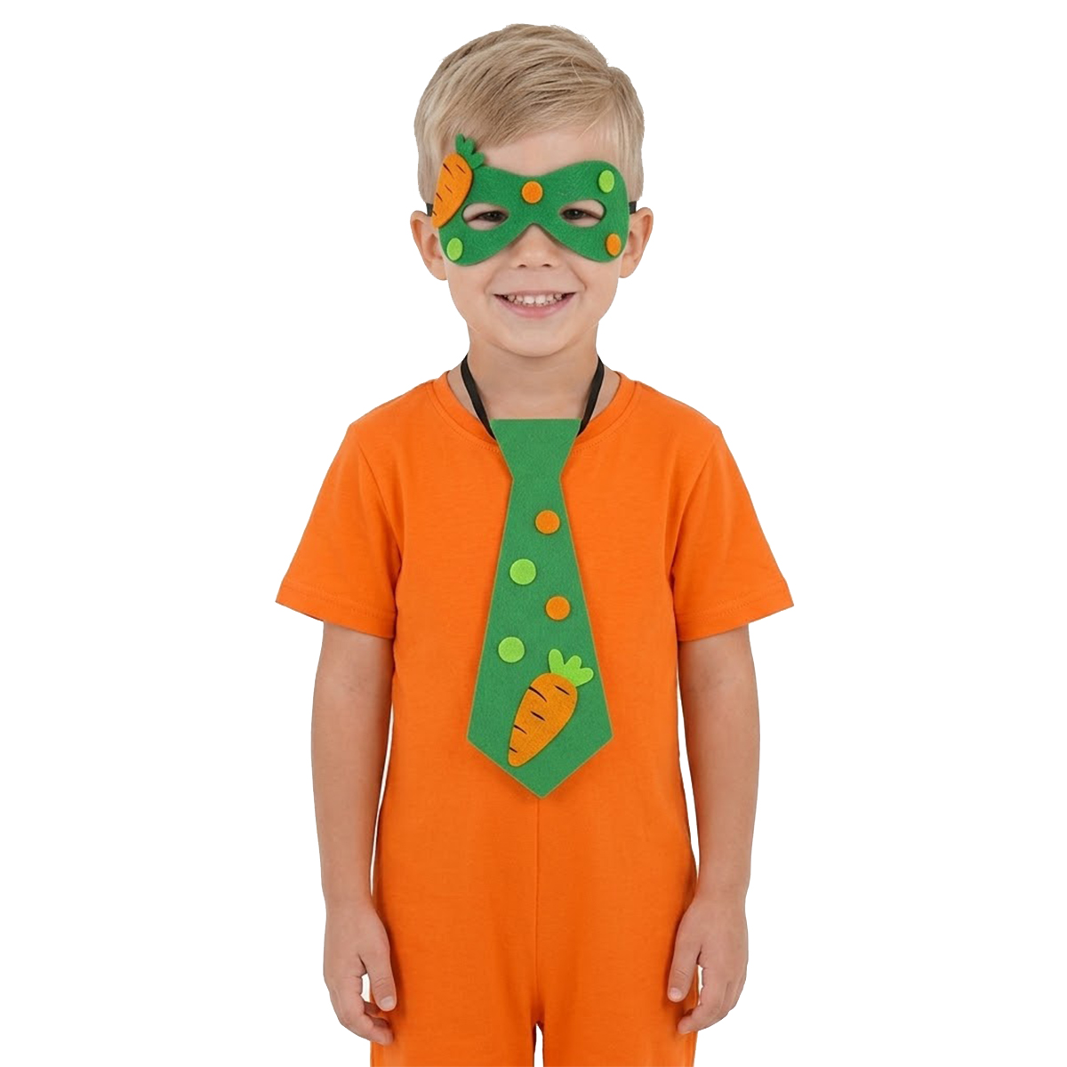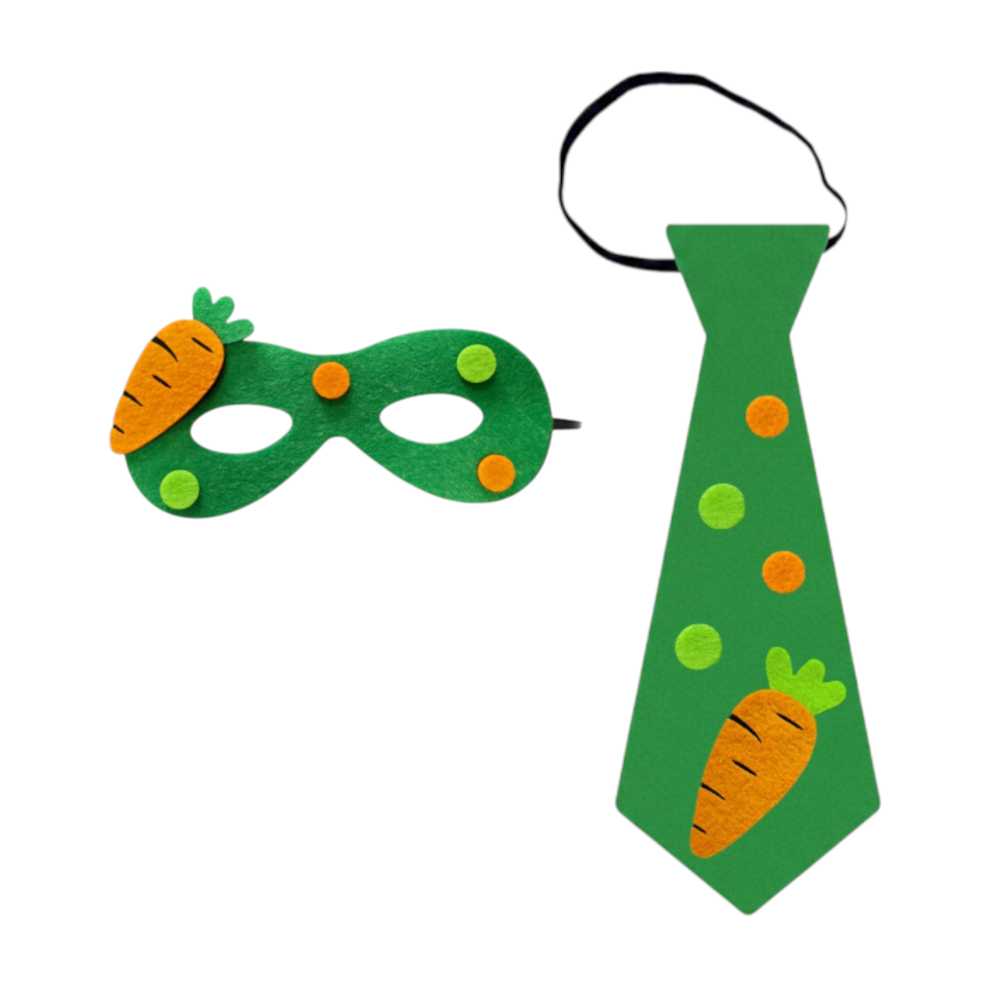 - ciemnozielony krawat wykonany z miękkiego filcu, został wzbogacony o pomarańczowy emblemat marchewki, a całość dopełniają kropki w kolorze zielonym i pomarańczowym.