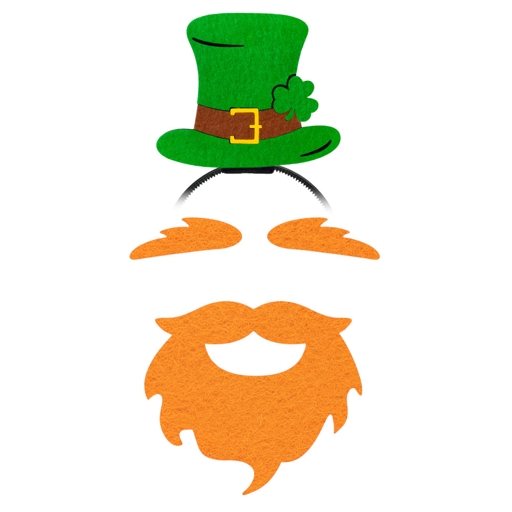 W skład zestawu wchodzi opaska z filcowym kapelusikiem Świętego Patryka oraz ruda filcowa broda z wąsami i brwiami - nieodłączny element wizerunku irlandzkiego skrzata! Kapelusik wykonany jest z miękkiego, przyjemnego w dotyku filcu, a broda mocowana na samoprzylepnym pasku taśmy, co zapewnia komfort noszenia. Dzięki uniwersalnemu rozmiarowi zestaw pasuje zarówno dzieciom, jak i dorosłym.