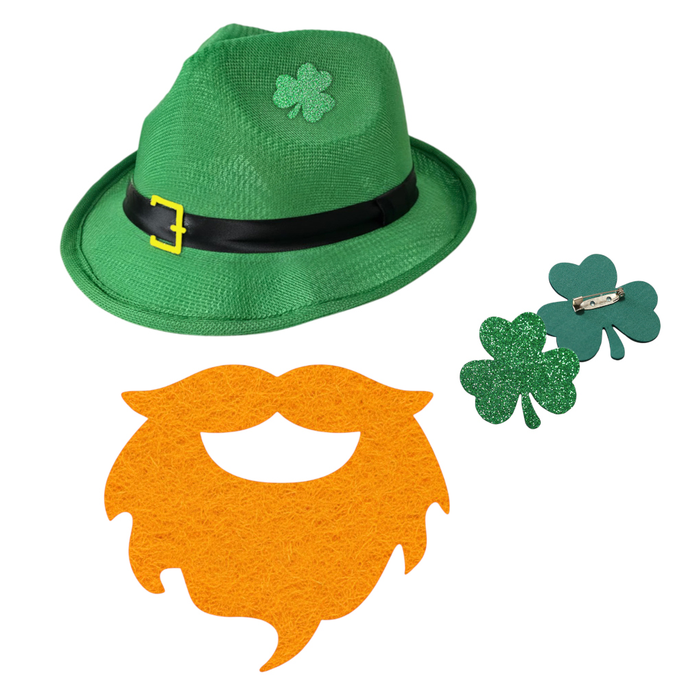 W skład zestawu wchodzi zielony kapelusz Świętego Patryka, przypinka koniczynka oraz ruda filcowa broda z wąsami - nieodłączny element wizerunku irlandzkiego skrzata! Kapelusz ozdobiony jest czarną, satynową tasiemką ze złotą klamrą oraz kilkoma piankowymi koniczynkami, nadając całości radosnego charakteru!