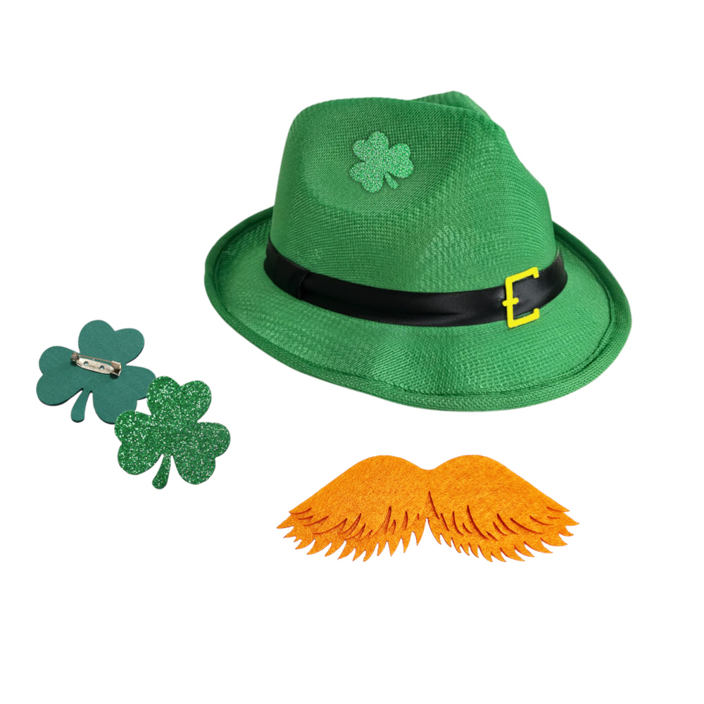 W skład zestawu wchodzi zielony kapelusz Świętego Patryka, przypinka koniczynka oraz rude filcowe wąsy - nieodłączny element wizerunku irlandzkiego skrzata! Kapelusz ozdobiony jest czarną, satynową tasiemką ze złotą klamrą oraz kilkoma piankowymi koniczynkami, nadając całości radosnego charakteru!