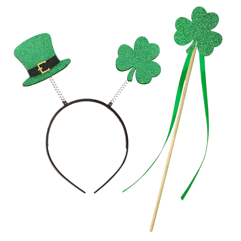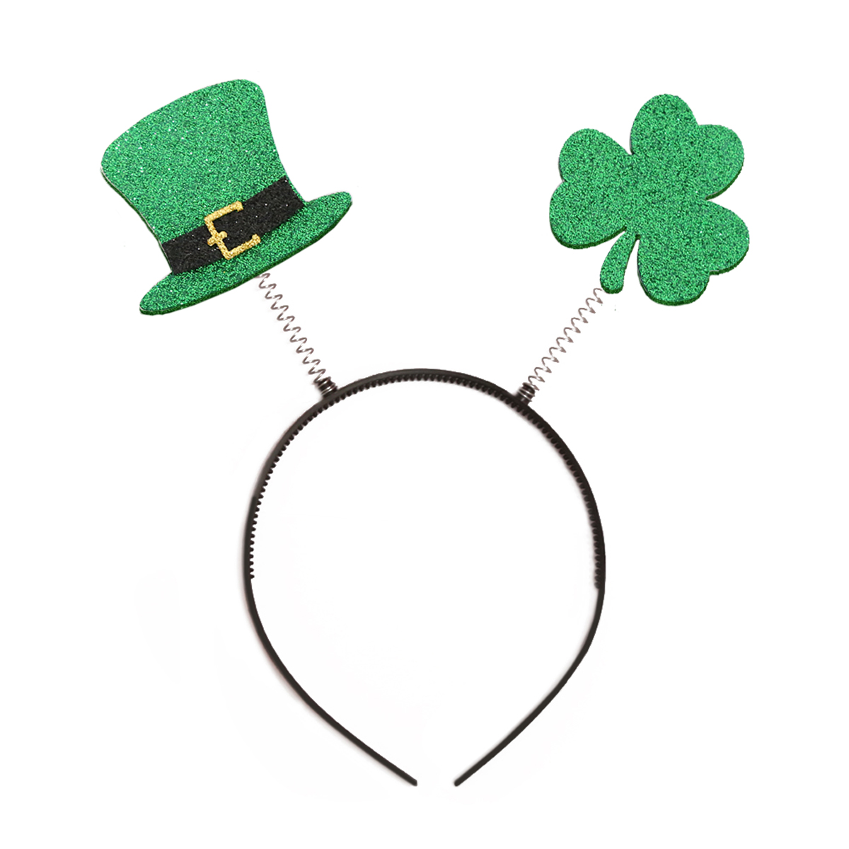 - opaska Świętego Patryka - osadzona jest na elastycznej opasce z dwiema sprężynkami, na których radośnie podskakują piankowa, brokatowa koniczynka oraz kapelusik Świętego Patryka: