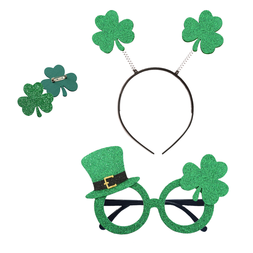Zbliża się Dzień Świętego Patryka i szukasz akcesoriów do stroju, które wpasują cię w odpowiedni klimat? Oto zestaw składający się z opaski z dwiema brokatowymi koniczynkami na sprężynkach, małej przypinki z koniczynką oraz okularów z koniczynką i kapelusikiem Świętego Patryka! Oba elementy wykonane są z brokatowej pianki, dzięki czemu opaska i okulary delikatnie połyskują przy każdym ruchu! Ich rozmiar jest uniwersalny, więc to dodatki pasujące zarówno dzieciom, jak i dorosłym!