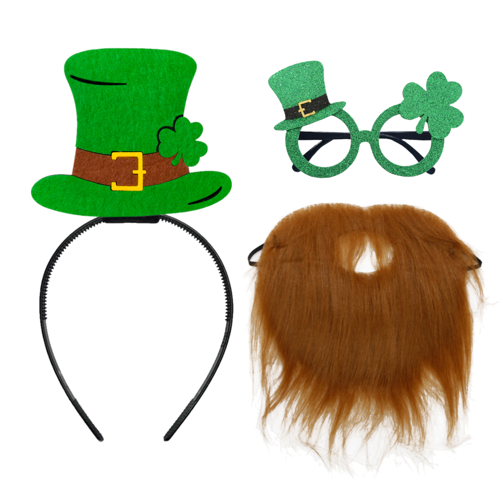 W skład zestawu wchodzi opaska z filcowym kapelusikiem Świętego Patryka, zielone okulary oraz ruda sztuczna broda z wąsami – nieodłączny element wizerunku irlandzkiego skrzata! Kapelusik wykonany jest z miękkiego, przyjemnego w dotyku filcu, plastikowe okulary bez szkieł okryte są piankową, brokatową obwódką z emblematem koniczynki i kapelusikiem, a broda mocowana na elastycznej gumce, co zapewnia komfort noszenia. Dzięki uniwersalnemu rozmiarowi zestaw pasuje zarówno dzieciom, jak i dorosłym.