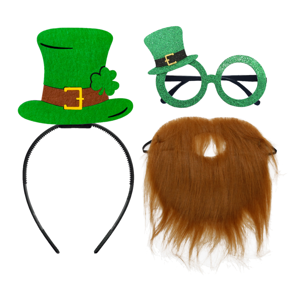 W skład zestawu wchodzi opaska z filcowym kapelusikiem Świętego Patryka, zielone okulary oraz ruda sztuczna broda z wąsami – nieodłączny element wizerunku irlandzkiego skrzata! Kapelusik wykonany jest z miękkiego, przyjemnego w dotyku filcu, plastikowe okulary bez szkieł okryte są piankową, brokatową obwódką z emblematem kapelusika, a broda mocowana na elastycznej gumce, co zapewnia komfort noszenia. Dzięki uniwersalnemu rozmiarowi zestaw pasuje zarówno dzieciom, jak i dorosłym.