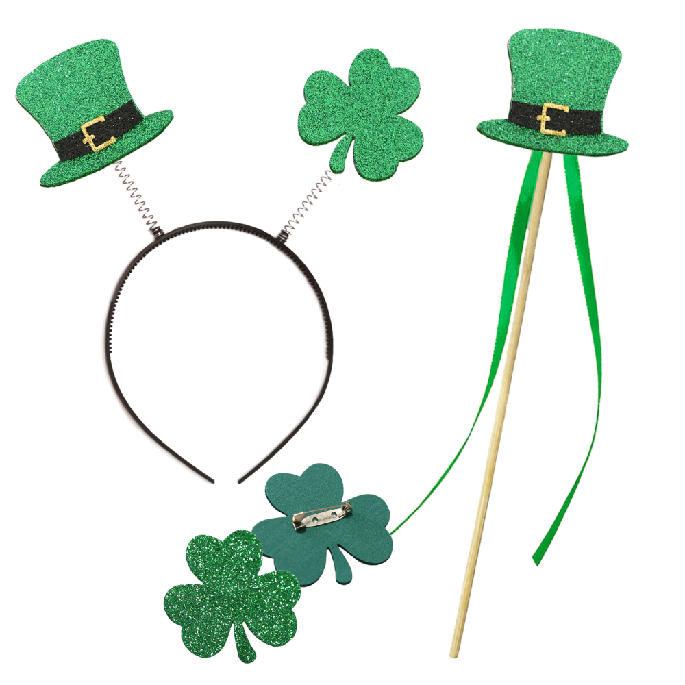 - różdżka Świętego Patryka - składa się z drewnianego patyczka, osadzonej na czubku piankowego, brokatowego kapelusika oraz dwóch satynowych tasiemek w żywym, zielonym kolorze: