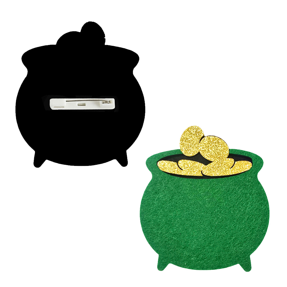 - przypinka garniec złota - filcowy emblemat w kształcie zielonego garnca ze złotem posiada przymocowaną z tyłu metalową agrafkę, dzięki której łatwo przypiąć ozdobę do ubrań, toreb i innych powierzchni.