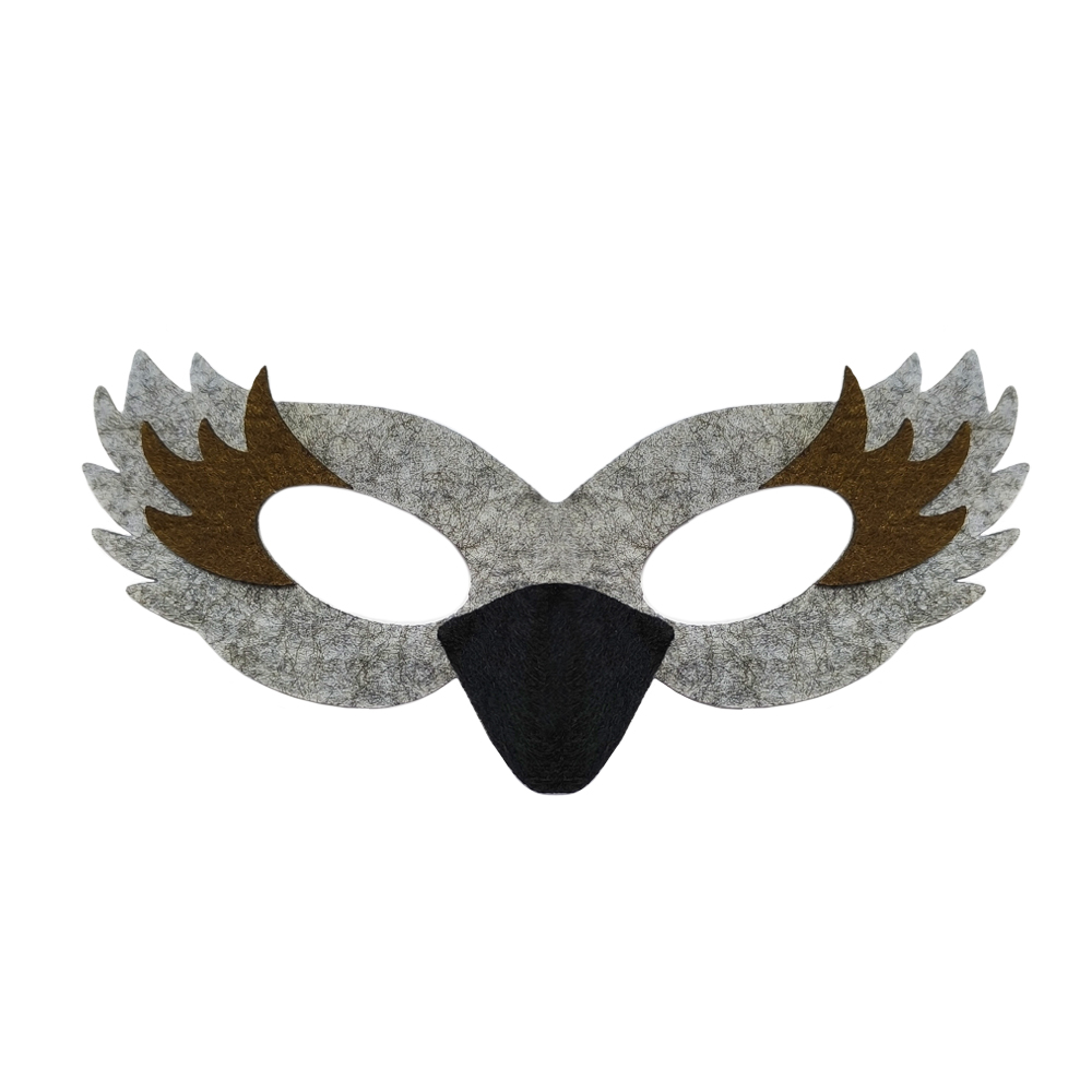 - filcowa maska wróbelka, wykonana z szarego filcu, ozdobiona jest lekko wypukłym czarnym dziobem oraz dekoracyjnymi, brązowymi piórkami: mocowana na gumce,
