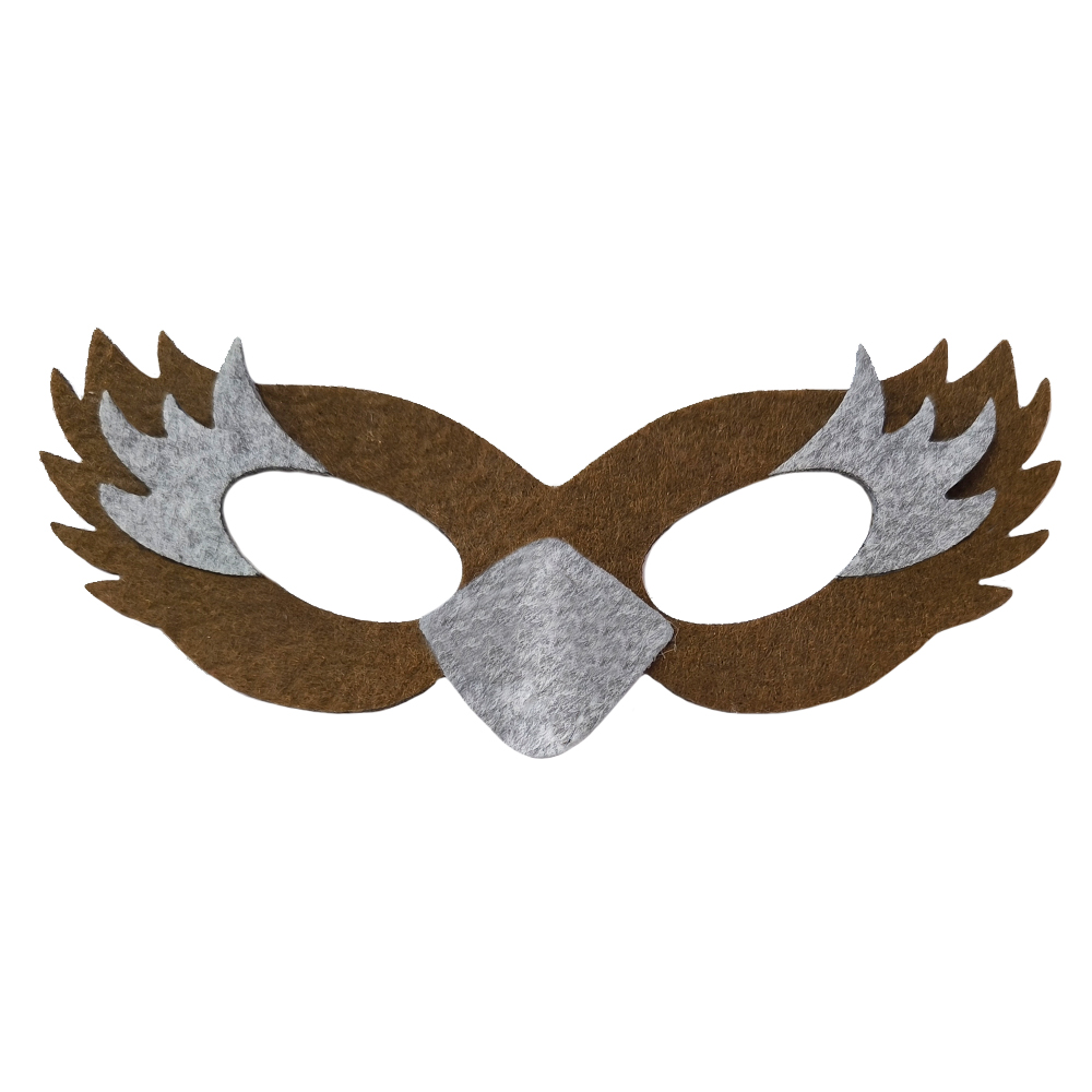- filcowa maska wróbelka, wykonana z brązowego filcu, ozdobiona jest lekko wypukłym szarym dziobem oraz dekoracyjnymi, szarymi piórkami: mocowana na gumce,