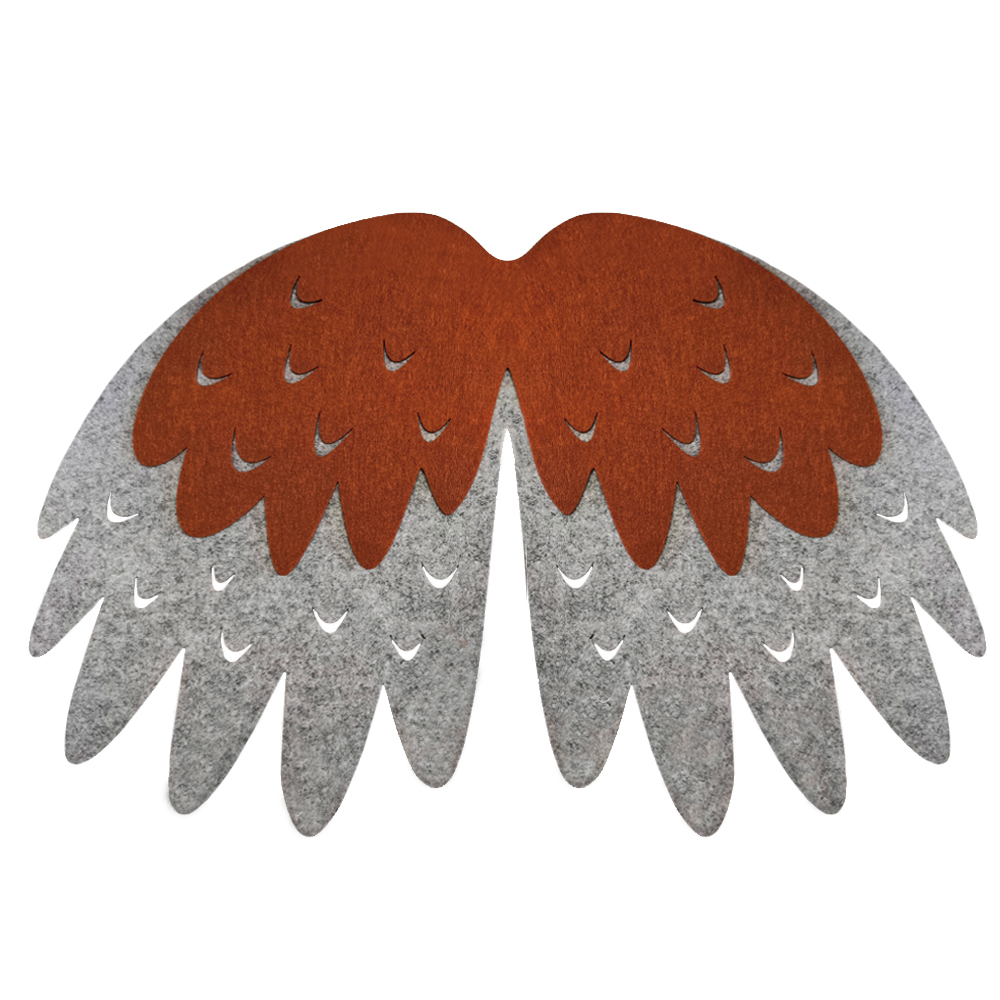 - filcowa peleryna w kształcie skrzydełek wykonana z dwóch warstw w kolorze szarym i brązowym, które oddają charakterystyczne ubarwienie wróbla,