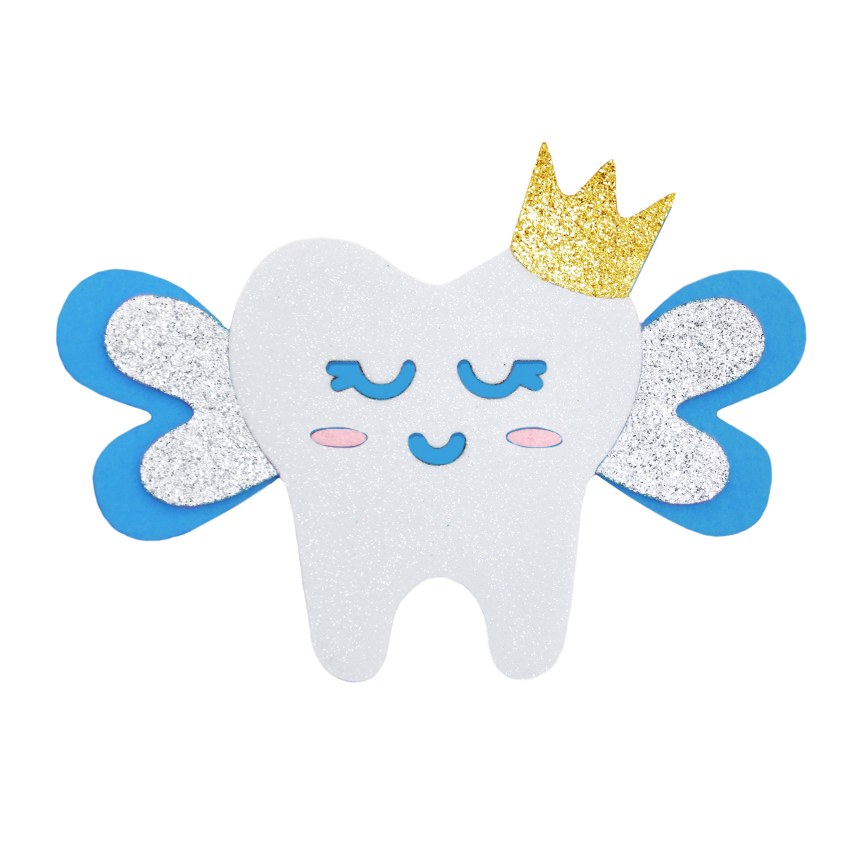 - różdżka Wróżki Zębuszki - składa się z dwóch warstw w kształcie ząbka: niebieskiego filcowego podkładu oraz subtelnie połyskującego emblematu z białej, brokatowej pianki. Całość osadzona jest na smukłym, białym plastikowym patyczku, uzupełniona delikatnymi foliowymi paseczkami w odcieniach różu i złota, które nadają ozdobie wyjątkowego blasku!