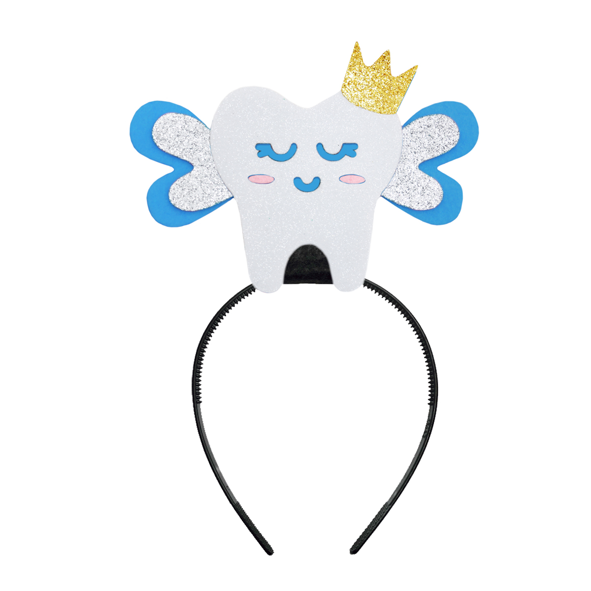 - opaska Wróżki Zębuszki - wykonana jest z brokatowej pianki z regulowanym zapięciem na rzep, co zapewnia komfort noszenia. Opaska przedstawia uroczy ząbek z radosną, rumianą minką, skrzydełkami wróżki oraz złotą koroną, które wprowadzą dziecko w bajkowy świat magii!