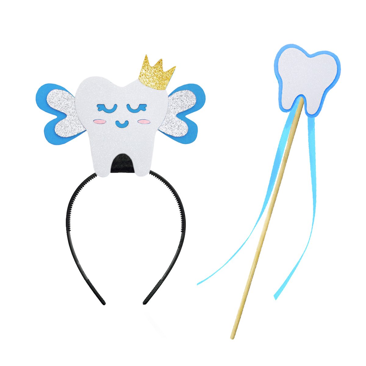 - opaska Wróżki Zębuszki - wykonana jest z brokatowej pianki z regulowanym zapięciem na rzep, co zapewnia komfort noszenia. Opaska przedstawia uroczy ząbek z radosną, rumianą minką, skrzydełkami wróżki oraz złotą koroną, które wprowadzą dziecko w bajkowy świat magii!