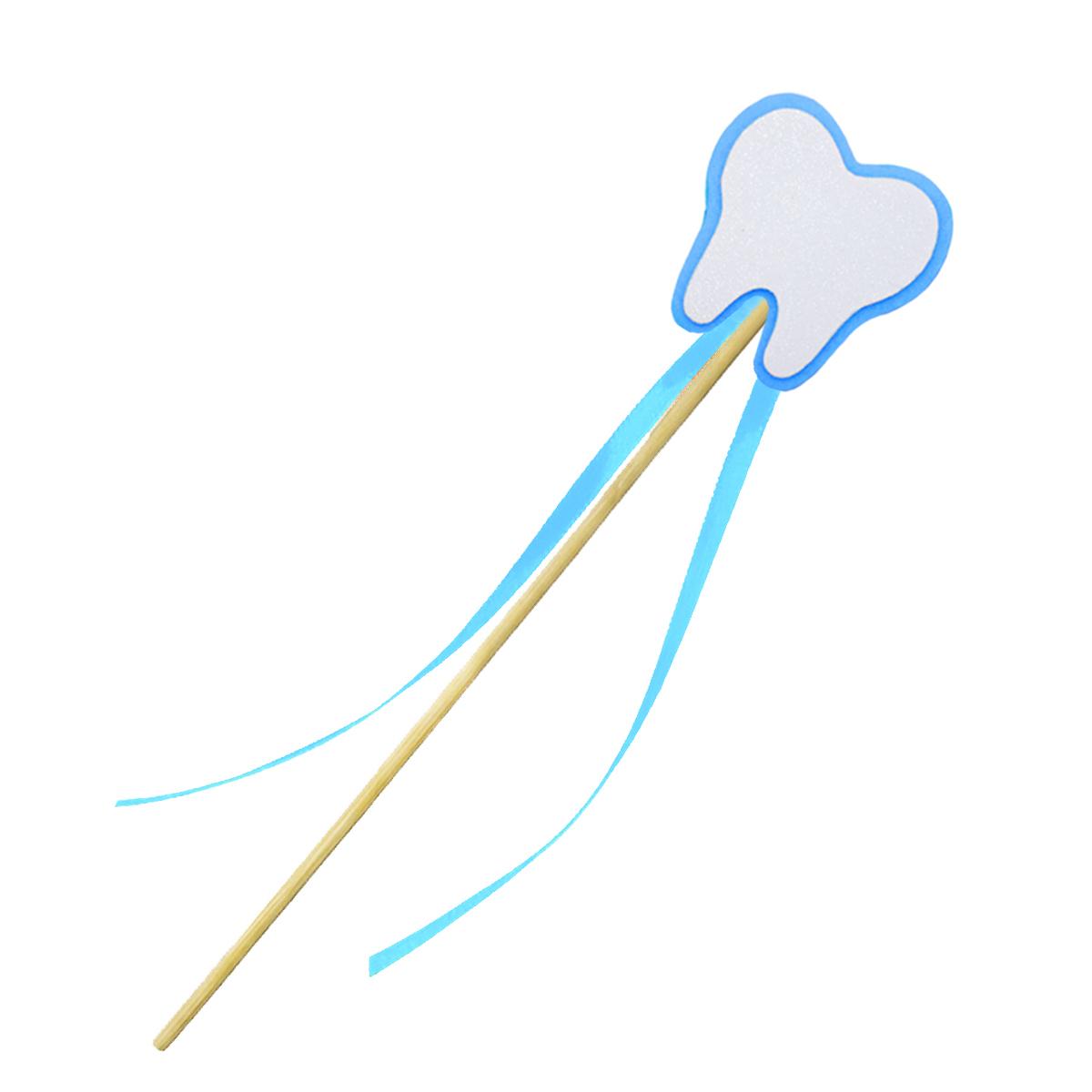 - różdżka Wróżka Zębuszka - drewniana różdżka posiada na szczycie filcowy emblemat radosnego ząbka i ozdobiona jest dodatkowo lekkimi, biało-błękitnymi tasiemkami: