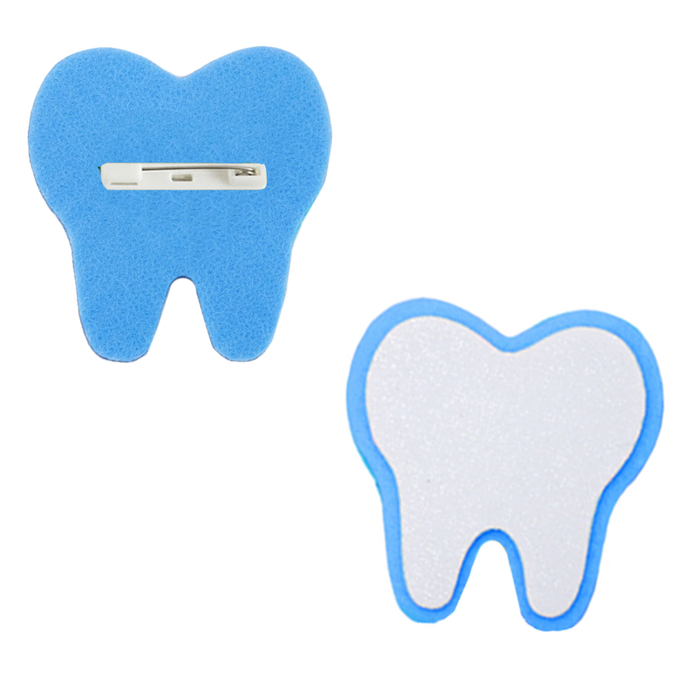 - przypinka ząbka - filcowy emblemat w kształcie białego ząbka posiada przymocowaną z tyłu agrafkę, dzięki której można przypiąć przypinkę do ubrania, torby i wielu innych powierzchni: