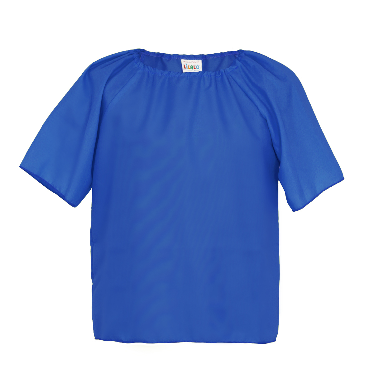 - niebieska bluzka - wykonana z lekkiego, niegniotącego się materiału pongee, ma krótki rękaw oraz regulowany tasiemkami dekolt: